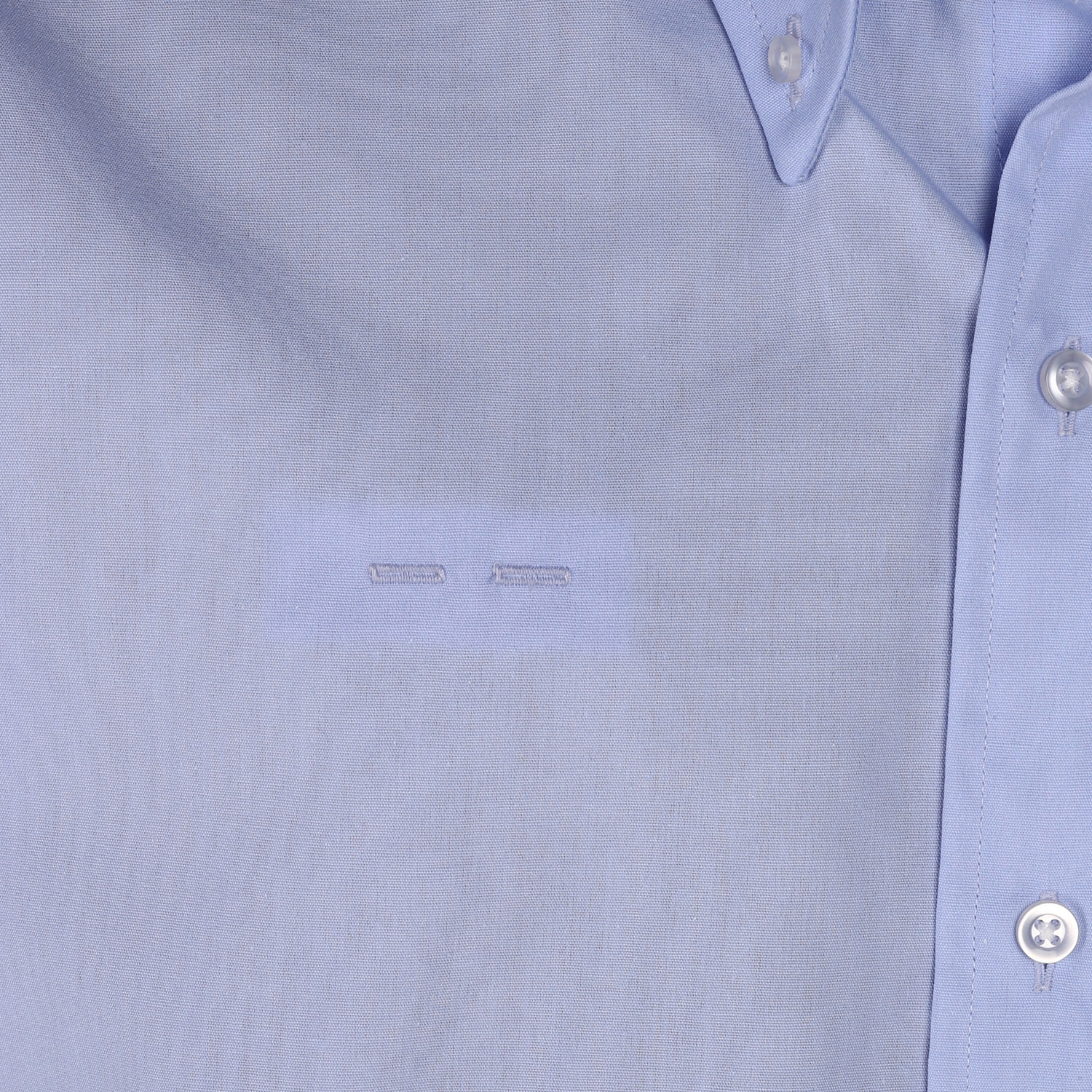 The men's short sleeve shirt is made of blue broadcloth permanent press, and has a button down collar, button front placket, and a pocket on left side with pencil compartment.